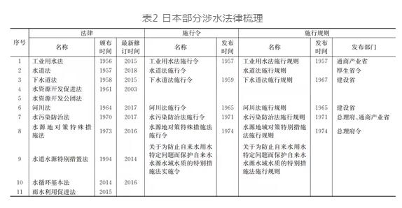 日本的法律體系可以分為憲法、法律、政令、省令和通達5個層次。通過國會頒布法律、內閣頒布政令以及省頒布省令,對涉水工作進行全面的規定(見表2)。例如國會頒布《河川法》,內閣負責發布《河川法施行令》,主管河道的國土交通省負責發布《河川法施行規則》。整個法律體系層次清晰、責任明確、詳略互補,全方位指導涉水工作的開展。日本城市水系統相關法律較為豐富,核心的涉水法律有《河川法》《水資源開發促進法》《水道法》《下水道法》《水污染防治法》等10余部,覆蓋了河流水系、水資源、供水、用水、排水、水環境和健康水循環理念等水系統多角度、全要素的內容。日本涉水法律內容詳盡,明確涉水工作的責任主體、職能分工、協調機制,部分法律還對技術標準進行詳細規定,例如《水道法》將水質基準的內容納入法律框架體系,強化了標準執行力度。日本涉水法律體系修訂更新周期短,如有必要最短1年時間即可開展法律修訂,例如《下水道法》在2005年、2011年和2015年分別針對城市內澇、事權改革、雨水公共下水道建設問題開展修訂,極大的保障了法律的適應性。