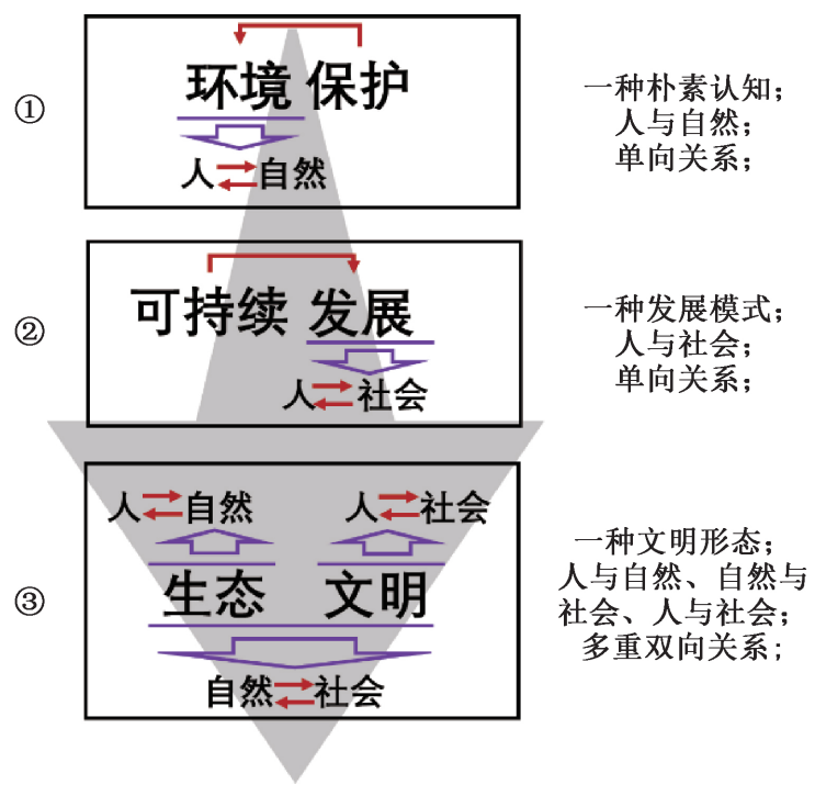“生態(tài)文明”的概念,描述的則是一種歷史上未曾出現(xiàn)過的文明形態(tài)。它提出以“人與自然、自然與社會、人與社會和諧共生、良性循環(huán)、全面發(fā)展、持續(xù)繁榮”為基本宗旨的社會形態(tài)。它的內(nèi)涵包括而又超越之前的認(rèn)識,“生態(tài)”兩字反映著人與自然的關(guān)系,保護(hù)自然同時(shí)享用自然;“文明”兩字反映著人與自然、社會之間的關(guān)系,人類要敬畏自然,個(gè)人服從社會,同時(shí)社會支撐個(gè)人的發(fā)展;“生態(tài)”與“文明”銜接,反映著自然與社會之間的關(guān)系,自然以資源的方式為社會提供物質(zhì)基礎(chǔ),社會以科技的方式尊重自然?!吧鷳B(tài)文明”概念,蘊(yùn)含多重雙向關(guān)系,超越了狹義的“環(huán)境保護(hù)”以及“可持續(xù)發(fā)展”,在關(guān)注“人與自然”關(guān)系的傳統(tǒng)觀念基礎(chǔ)上,增加了對“自然與社會”和“人與社會”之間和諧關(guān)系的強(qiáng)調(diào),是對環(huán)境保護(hù)概念的一次創(chuàng)造性升級深化,為人類文明的走向提供了一種超越“工業(yè)文明”的新形態(tài),即,這是一種“生態(tài)”的“文明”,這種“文明”以文明的方式對待“生態(tài)”。