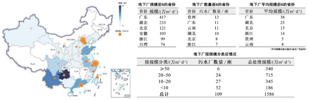 客觀上,我國地下污水處理廠建設(shè)呈現(xiàn)逐年增長的趨勢,發(fā)展十分迅速。據(jù)不完全統(tǒng)計(jì),截至2020年底,我國地下污水處理廠數(shù)量達(dá)到109座,總處理規(guī)模1 586萬m3/d,其中半數(shù)地下廠規(guī)模超過10萬m3/d,近半數(shù)污水由20萬~50萬m3/d區(qū)間規(guī)模的大型地下廠處理,為全世界地下廠數(shù)量最多的國家。具體來說,我國地下污水處理廠分布具有明顯的地區(qū)集中性特點(diǎn),主要分布于環(huán)渤海、長三角和珠三角等經(jīng)濟(jì)發(fā)達(dá)地區(qū),以及地貌較復(fù)雜的云貴川區(qū)域。如圖3所示,以污水處理規(guī)模計(jì),地下廠規(guī)模最大的省份分別為廣東、湖北和北京,日處理規(guī)模均超過百萬立方米,其中廣東省規(guī)模居首,達(dá)到417萬m3/d。以數(shù)量計(jì),擁有最多地下廠數(shù)量的省份分別為貴州、廣東和云南,均達(dá)到10座以上。不同地域的地下污水處理廠,其污水處理規(guī)模具有顯著差異,云、貴兩省的地下廠規(guī)模相對較小,平均規(guī)模4萬~5萬m3/d;而北京、浙江的地下廠平均規(guī)模相對較大,達(dá)到14萬~15萬m3/d;而廣東、湖北地下廠平均規(guī)模較大,分別為23萬m3/d、38萬m3/d。地下污水處理廠已經(jīng)成為“十四五”期間市政污水處理行業(yè)的新增長點(diǎn)。
