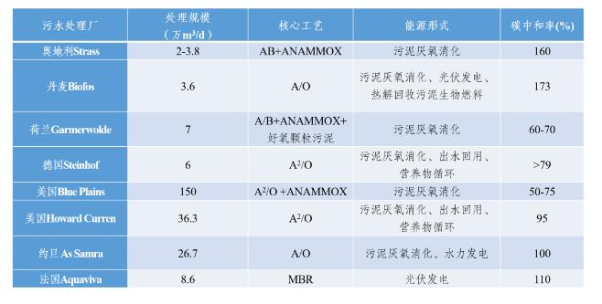 以下是國外相關污水處理廠通過能源利用或相關技術革新實現碳中和的代表案例。可看出,一些污水處理廠已實現100%能量自給,達到碳中和。