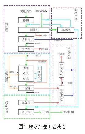 根據(jù)酚氰廢水的水質(zhì)特征,確定采用重力除油+加壓溶氣氣浮+sdn(a/oo+二沉池)+混凝沉淀的核心工藝對其進(jìn)行處理,工藝流程如圖 1所示。