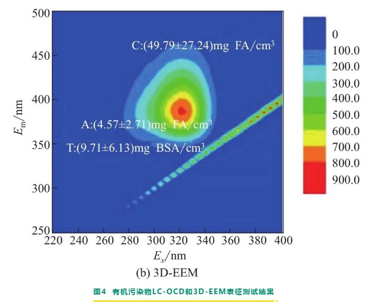 除了污染物和污染膜的表征外,水樣分析結果也可以對有機污染類型作出診斷。jeong等對用于海水淡化運行8年的反滲透膜元件進行了剖檢分析,剖檢對象選擇的是三種不同位置的膜元件,分別位于一級反滲透系統的前部、中部和后部。污染膜的表面可以看到有一層均勻的褐色沉積物,濃水側隔網和進水側污染較重,產水側附近污染最輕。由lc-ocd和3d-eem表征的水樣測試結果(圖4)分析可得,膜的有機污染物主要是腐殖質物質和小分子中性物質。tang等對用于城市污水回用處理運行2個月的反滲透膜元件進行了剖檢分析,該元件位于一段反滲透系統,通過loi、ftir、doc、eem、樹脂分離等分析,得出膜污染物大部分是含不飽和碳或芳香環的微生物類和腐殖質類有機污染。許家晟等對用于自來水廠出水深度處理的碟管式納濾膜進行了膜污染分析,從膜表面可明顯看到一層較滑膩的黃色污泥層,并伴有黑色顆粒物質,且底部出水端膜片污染更嚴重。通過sem-eds分析得出,膜污染物以有機污染為主,經ftir和3d-eem進一步分析得出,膜表面的有機污染成分主要是類富里酸物質、類腐殖酸物質及一些微生物代謝產物,并存在一定程度的生物污染。