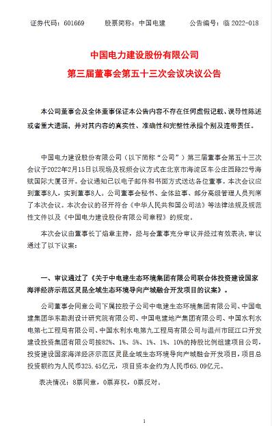 近日,中國電建發布公告稱,公司審議通過了《關于中電建生態環境集團有限公司聯合體投資建設國家海洋經濟示范區靈昆全域生態環境導向產城融合開發項目的議案》。